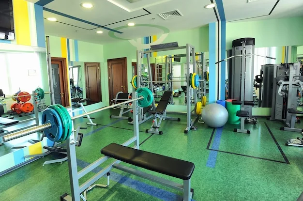 مشینوں، آلات اور ورزش اور فٹنس کلاسز کے لیے مفت وزن کے ساتھ ایک اچھی طرح سے لیس فٹنس سینٹر۔